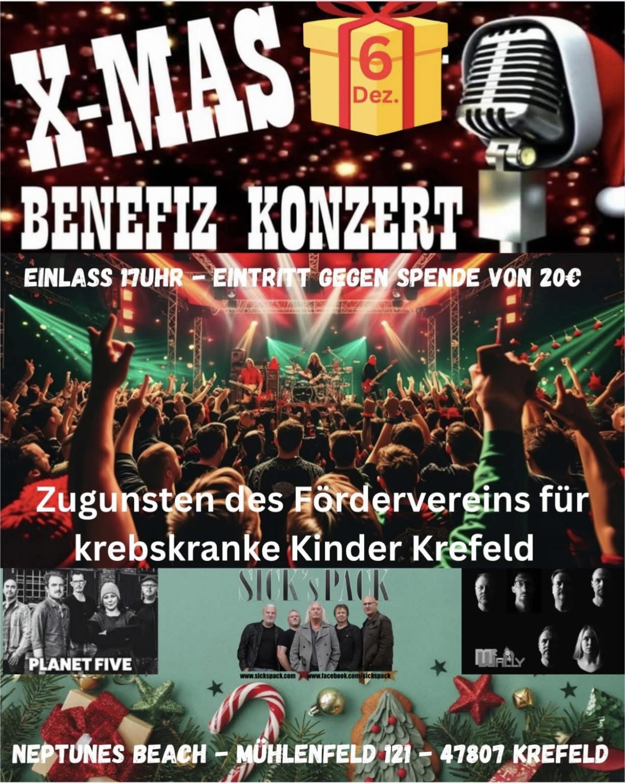Nach dem Erfolg im Vorjahr geht es weiter: Andrea und Rainer Blome organisieren das zweite X-MAS Benefiz Rockkonzert mit dem Team des Neptunes Beach und auf dem Gelände des Schwimmbads am Mühlenfeld. „Wie im Vorjahr sind wieder drei Krefelder Bands dabei, alle hatten direkt zugesagt, dass sie wieder mitmachen“, freut sich Andrea Blome. Konkret: Die Besucher können sich auf drei in Krefeld gut bekannte Band freuen: Sick‘s Pack, Planet five und Mr. Wally. „Alle stehen für gute Stimmung und tollen Sound. Wir freuen uns, dass alle bereit sind, unsere Aktion wieder unentgeltlich zu begleiten“, freut sich Andrea Blome. Die Bands hatten bei der Premiere des XMAS Rock im Dezember 2024 gespielt. Die Blomes organisieren den X-MAS Rock wieder zugunsten des Fördervereins zugunsten krebskranker Kinder und spenden den Erlös an den Verein. „Wir sind Oliver Vosen und seinem Team im Neptunes Beach sehr dankbar, dass er uns so unterstützt“, freuen sich beide. Das Konzert in „Neptunes Beach“ (Mühlenfeld 121) findet am 6. Dezember 2025 statt. Einlass ist ab 17 Uhr. Karten gibt es gegen eine Spende (20 Euro) bei Neptunes Beach und bei Fuchs [...]